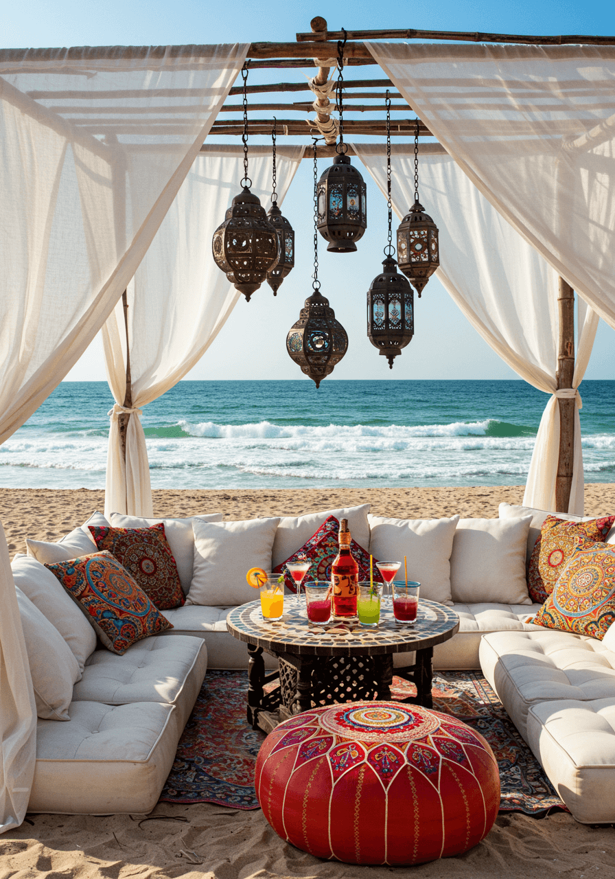 This is more than decor—it’s an experience. By blending natural textures, jewel-toned lighting, and seating that invites guests to sink in and stay till dawn, you’ll craft a beach party that feels like a wanderer’s dream.